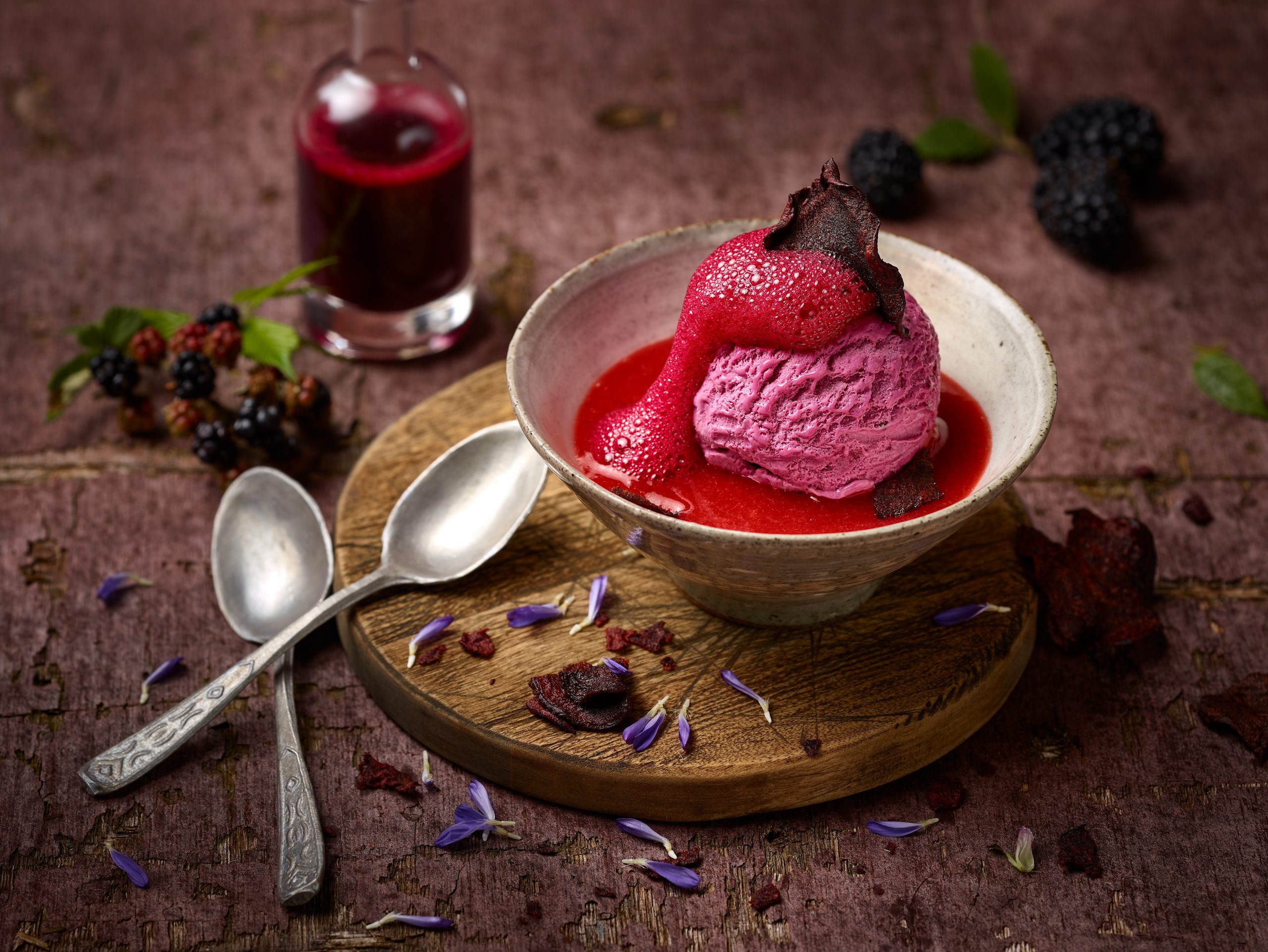 Eine wunderschöne Kugel Brombeereis liegt leicht angeschmolzen in einer handgetöpferten Schale. Sie ist mit einem Roto Bete Schaum garniert. In der Schale ist ausserdem Rote Bete Sauce. Die Schale steht auf einem uniquen Holzbrettchen. Zwei alte Silberlöffen liegen schön drapiert an den Bretchen. Im Umfeld sind Brombeerzweige mit reifen Brombeeren daran zu sehen. Ausserdem ist eine Glasfläschchen mit zusätzlicher Brombeersauce im Bild. Der Untergrund ist eine alte, lilane Holztafel. Nach hinten ist ein schönes Bokeh zu sehen. Die Perspektive ist leicht von oben. Fotografiert wurde dieses Bild mit einer Fuji GFX 100 Kamera bei Blende 8.